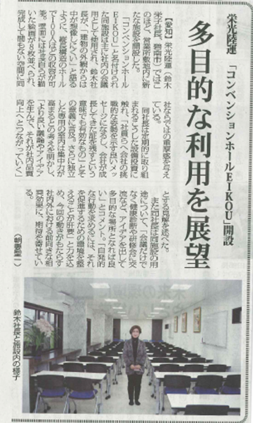 「コンベンションホールEIKOU」と名付けられた同施設は主に社内の会議用として使用され、鈴木社長が、「建物の外観からは中が想像しにくい」と語るように、縦長構造のホールで100人ほどの収容が可能。壁面には社長自らが描いた絵画が8枚並べられ、完成して間もない空間に同社ならではの重厚感を与えている。