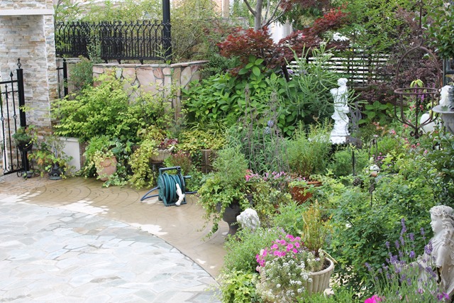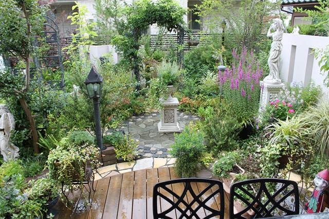 ウッドデッキから見る庭です。            花もグリーンも生き生きしています。