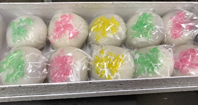 伊賀饅頭は、平べったい饅頭の中にあんこが入っていて上には、色づけされた米粒が乗っています。