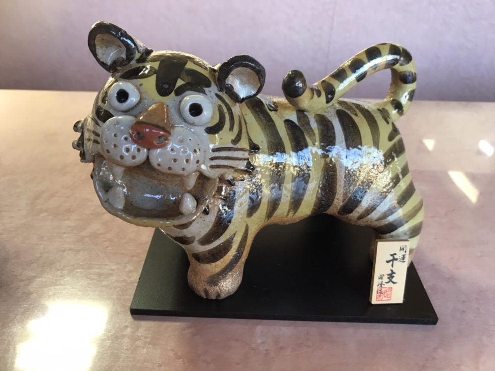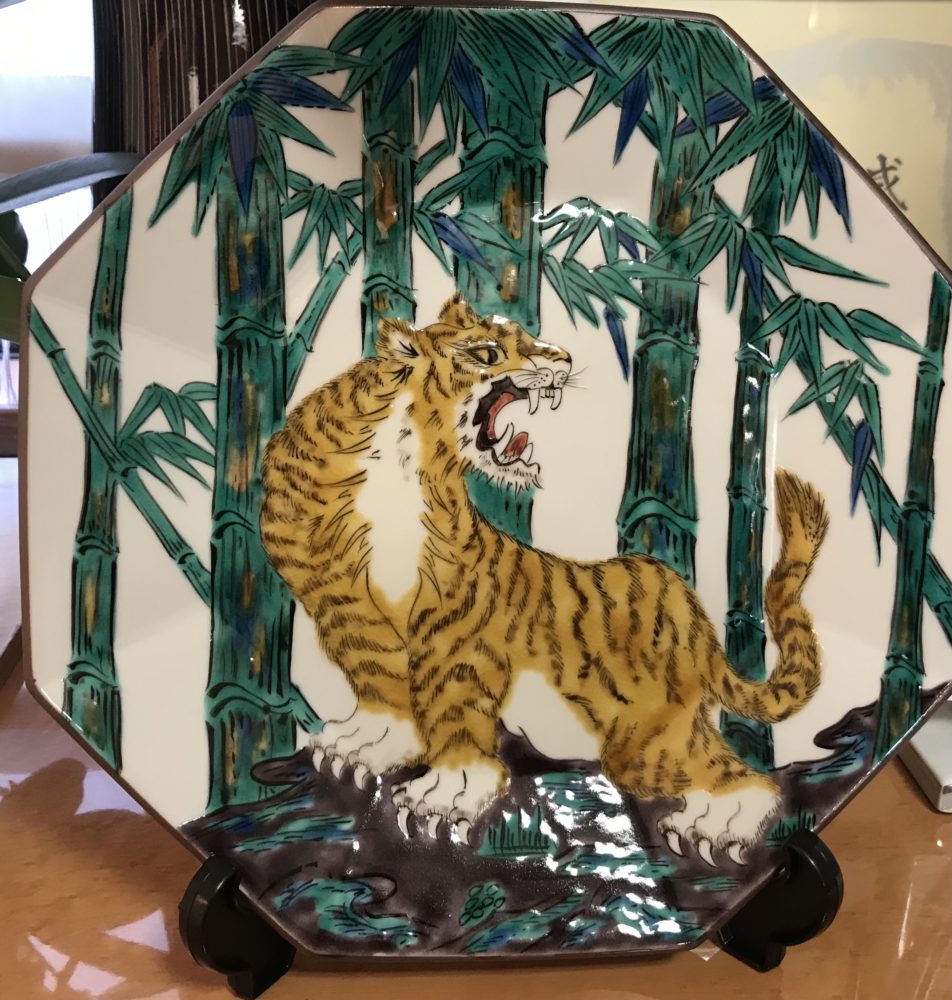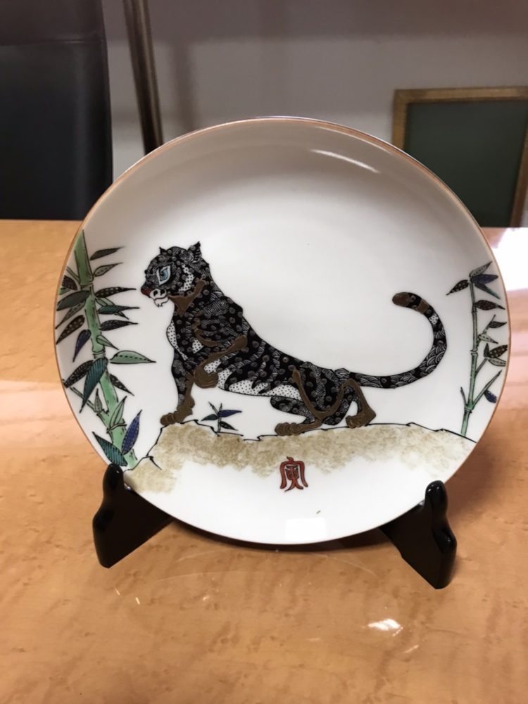 事務所に九谷焼の絵皿と常滑焼の置物が飾ってあります。九谷焼の寅はとても勇敢で素敵な絵皿です。社長は、いつも素敵な物を探して事務所や花苑に飾っています。