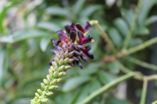 深い紫色の花がいくつもありアーチに育っています。