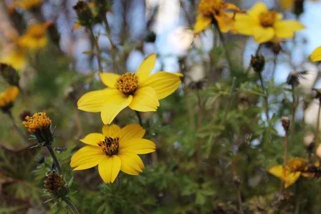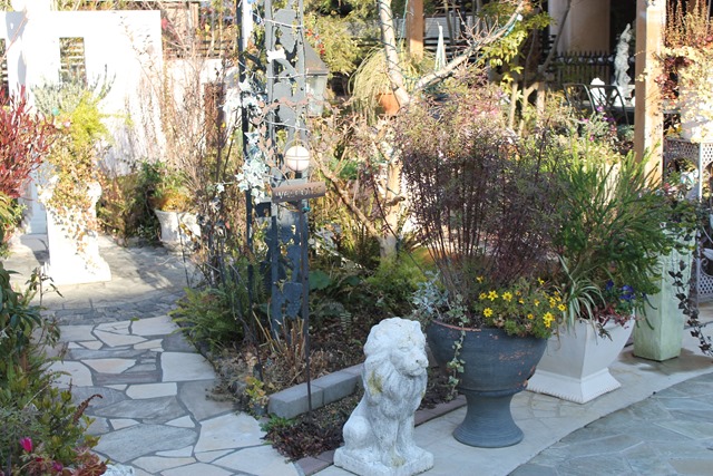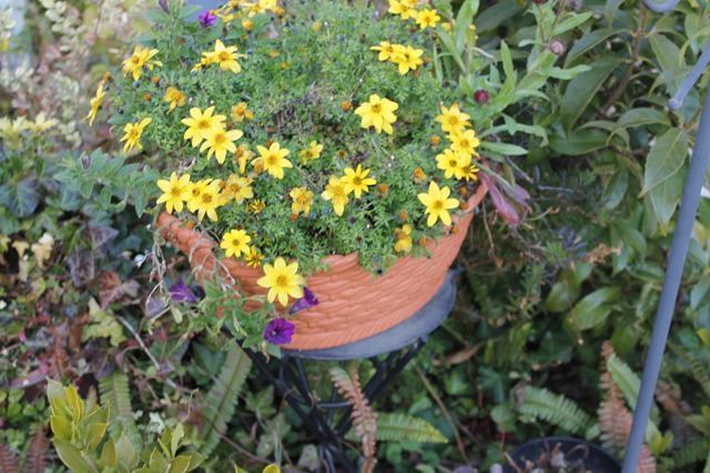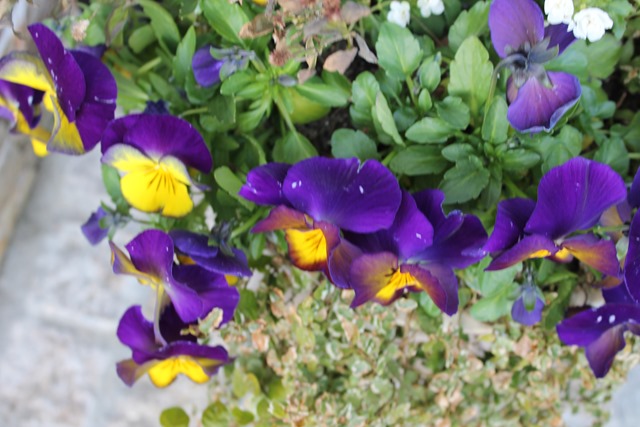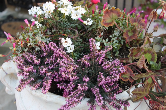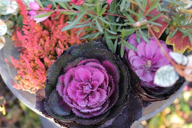 ミニバラ、パンジー、デイジー、葉牡丹など沢山の花や緑が寄せ植えしてあります。