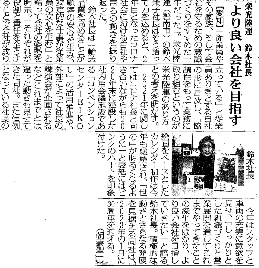 「従業員やその家族、そして会社を守るための意識づくりをすすめた一年だった」。栄光陸運(碧南市)の鈴木栄子社長はそう語って力を込めると、2年目となったコロナ社会における自社や自らの動きを振り返った。