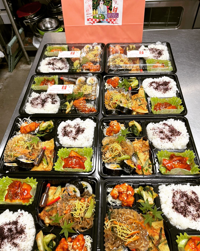 キンパ、ヤンニョムチキン、チャプチェ、チヂミなど花苑の人気メニューが入ったお弁当になります。
