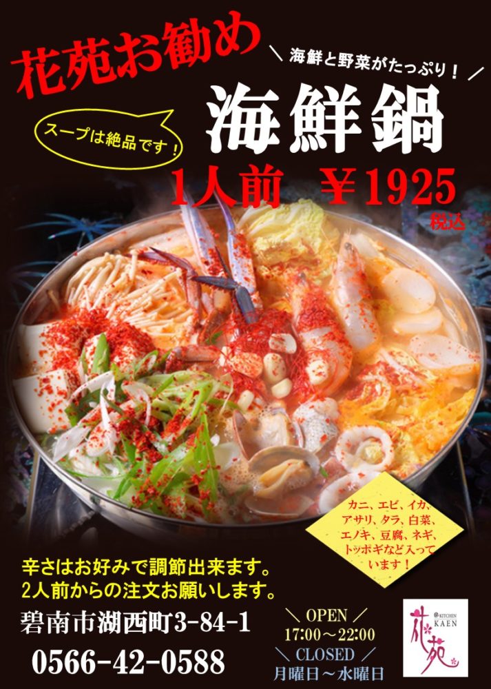 海鮮鍋は、たっぷりの海鮮と野菜と豆腐が入った花苑特選鍋になります。