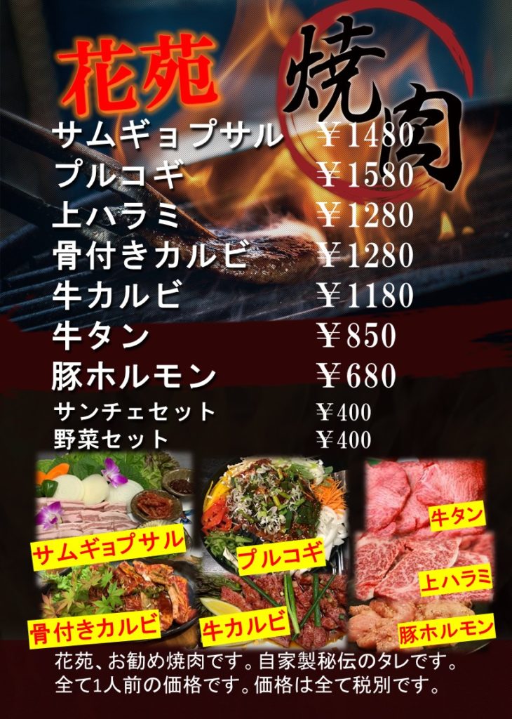 花苑、焼肉メニューです。
