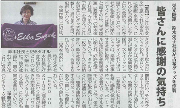 「これまで支えてくれた皆さんに感謝する思いと、これからもお願いしますという気持ち。これを見てくれることで、当社や私を頭に思い浮かべてくれれば嬉しい」と話すのは、栄光陸運(碧南市)の鈴木栄子社長。今年の9月に「古希」を迎え、これを記念したグッズを作製し、取引先や社内で配布している。
