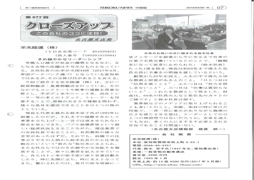平成30年4月20日、帝国データバンク発行の帝国ニュース中部版に社長のインタビュー記事が掲載されました。