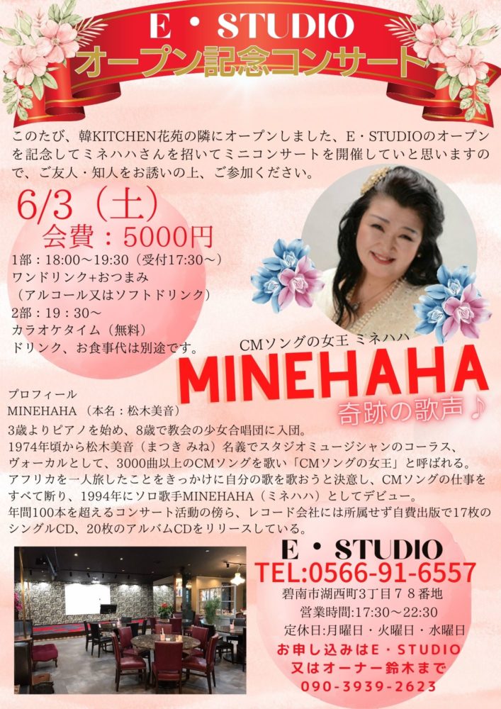 2023年4月17日 / 最終更新日時 : 2023年4月17日 eikou information E・STUDIO コンサート 6月3日(土)にE・STUDIOのオープン記念コンサートをミネハハさんを招いて開催いたします。 ご友人、知人をお誘いの上、ご参加ください。