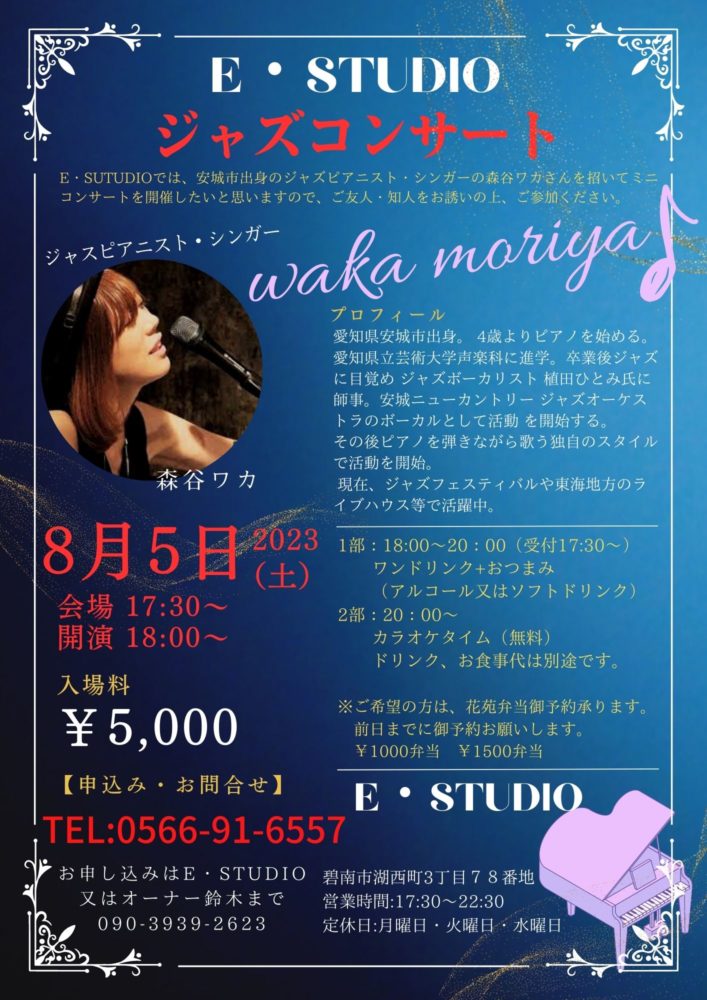 2023年6月28日 / 最終更新日時 : 2023年8月8日 eikou information E・STUDIO E・SUDIOで安城市出身のジャズピアニスト・シンガーの森谷ワカさんを招いてミニコンサートを開催します。